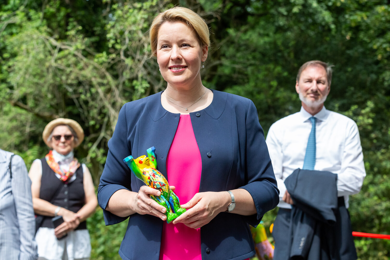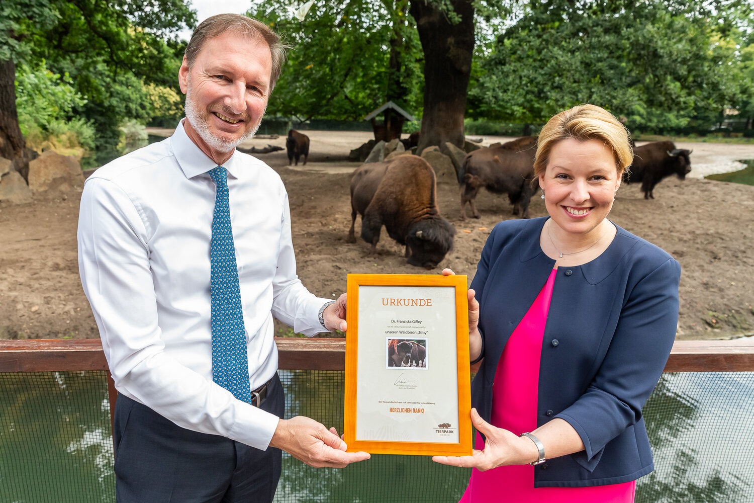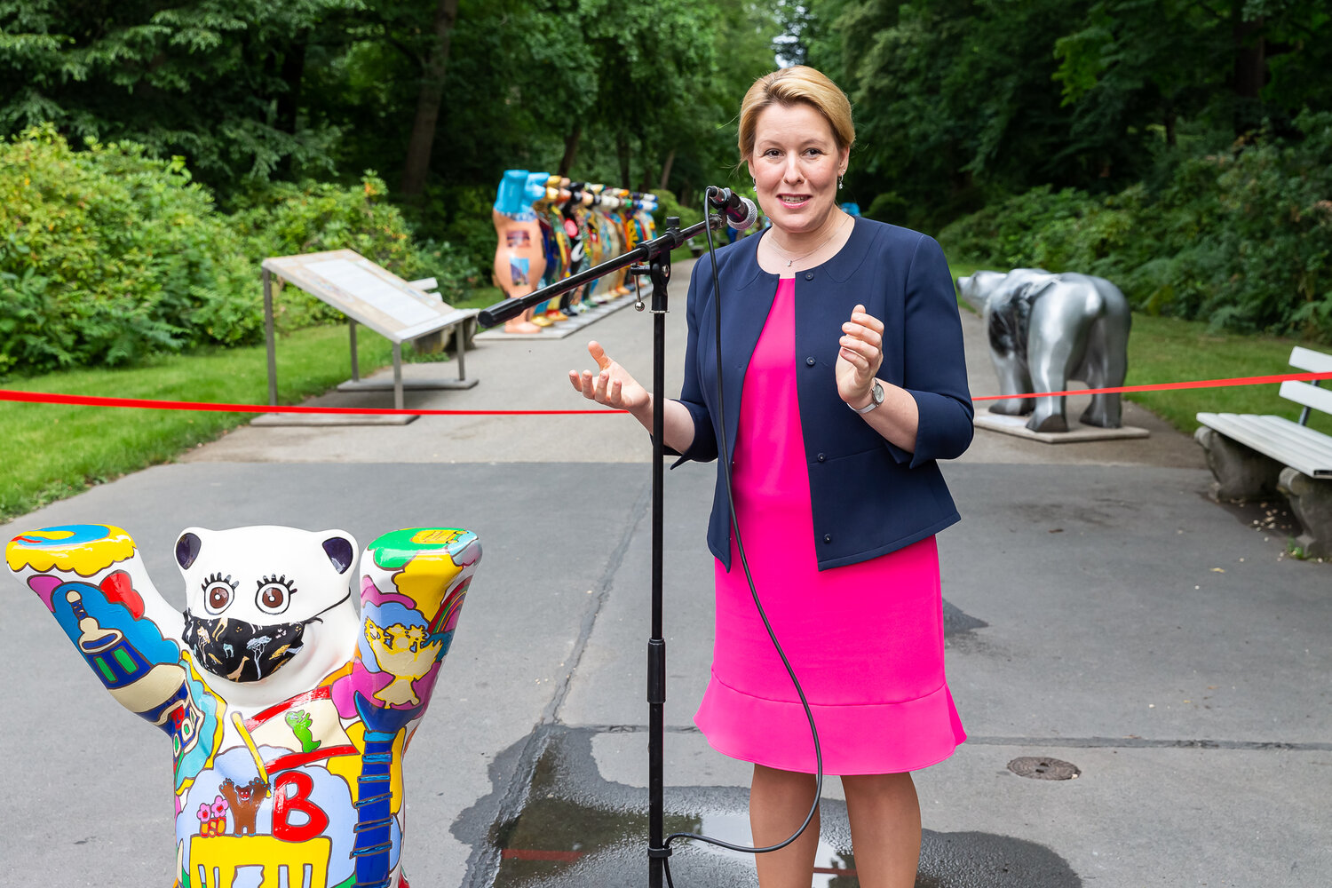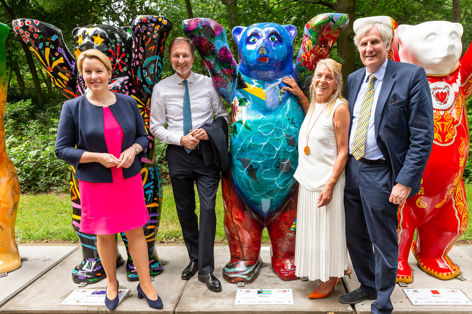 Bundesfamilienministerin Dr. Franziska Giffey, die zusammen mit dem Regierenden Bürgermeister Michael Müller die Schirmherrschaft für die Ausstellung übernommen hat, im Tierpark Berlin. Bundesfamilienministerin Dr. Franziska Giffey: „Mit dem Tierpark Berlin als einem Ort der Vielfalt fügt sich diese außergewöhnliche Ausstellung hervorragend in die natürliche Kulisse ein. Auf ihrer Welttournee durch bisher fünf Kontinente werben die United Buddy Bears für Toleranz und Verständigung zwischen Völkern, Kulturen und Religionen. Ich wünsche mir, dass diese wichtige Botschaft durch dieses Projekt weiterhin in die Welt getragen wird.“