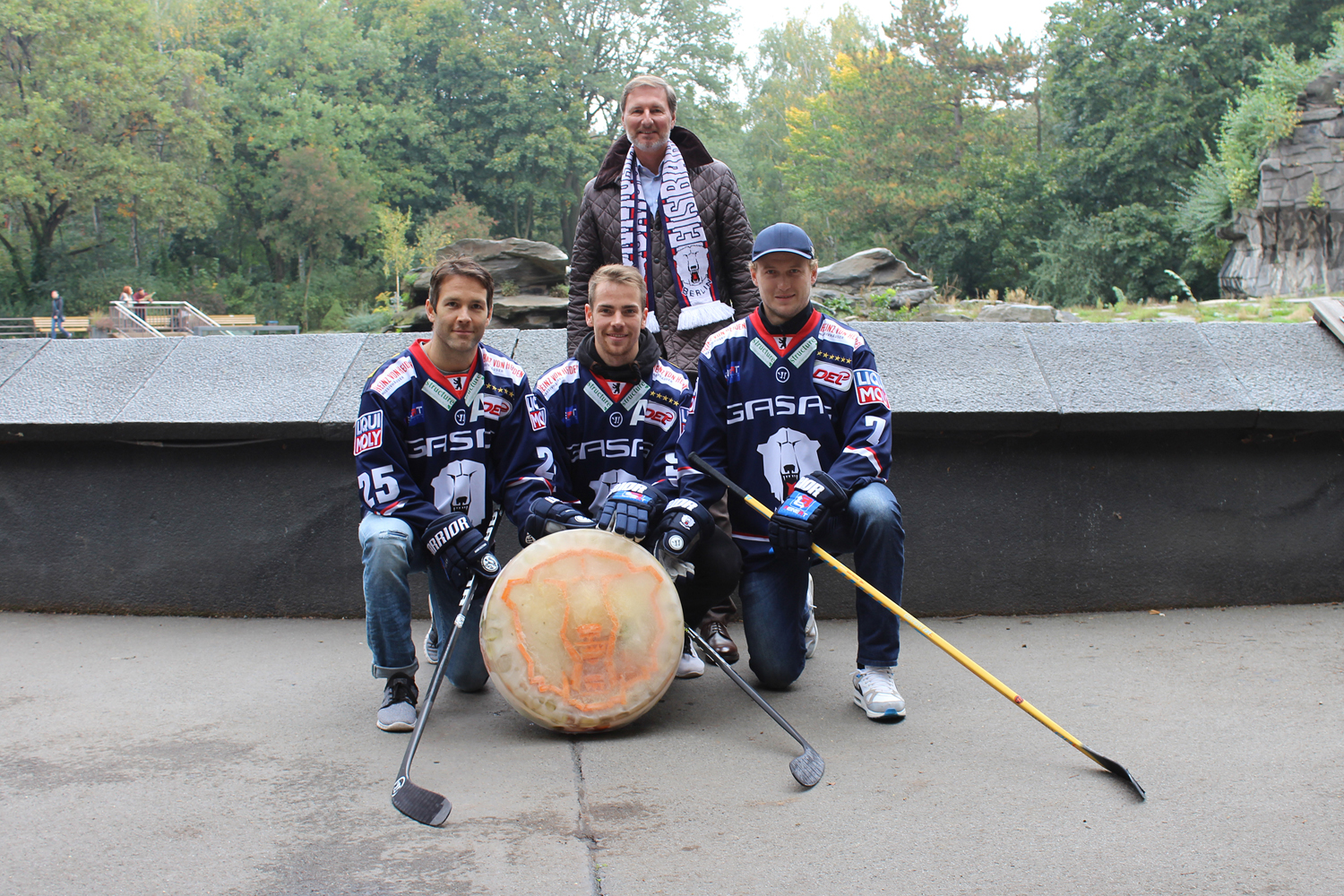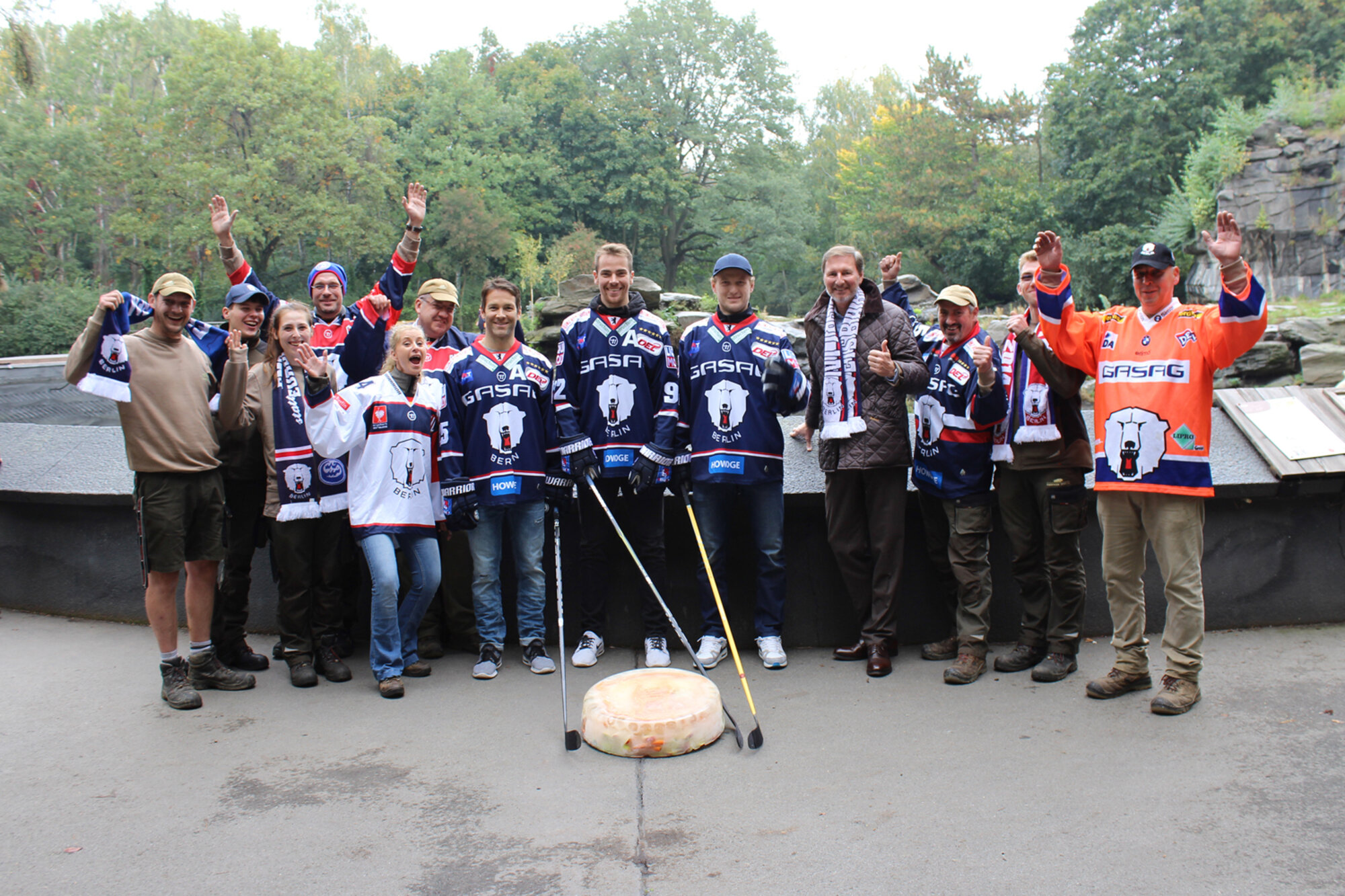Auch Tonja kam an diesem besonderen Tag auf ihre Kosten: Eisbären-Maskottchen „Bully“ hatte für sie einen mit Karotten, Äpfeln und Birnen gefüllten Eishockey-Puck im Maxiformat im Gepäck. Sehr zur Freude einiger Eishockey-Fans waren auch die Spieler Marcel Noebels, Frank Hördler und Micki DuPont vor Ort, um die rund 200 kg schwere Eisbärendame als neustes Teammitglied willkommen zu heißen. Die Eisbären Berlin gehören zu den bekanntesten Sportvereinen der Hauptstadt und sind Rekordmeister der Deutschen Eishockey Liga (DEL).