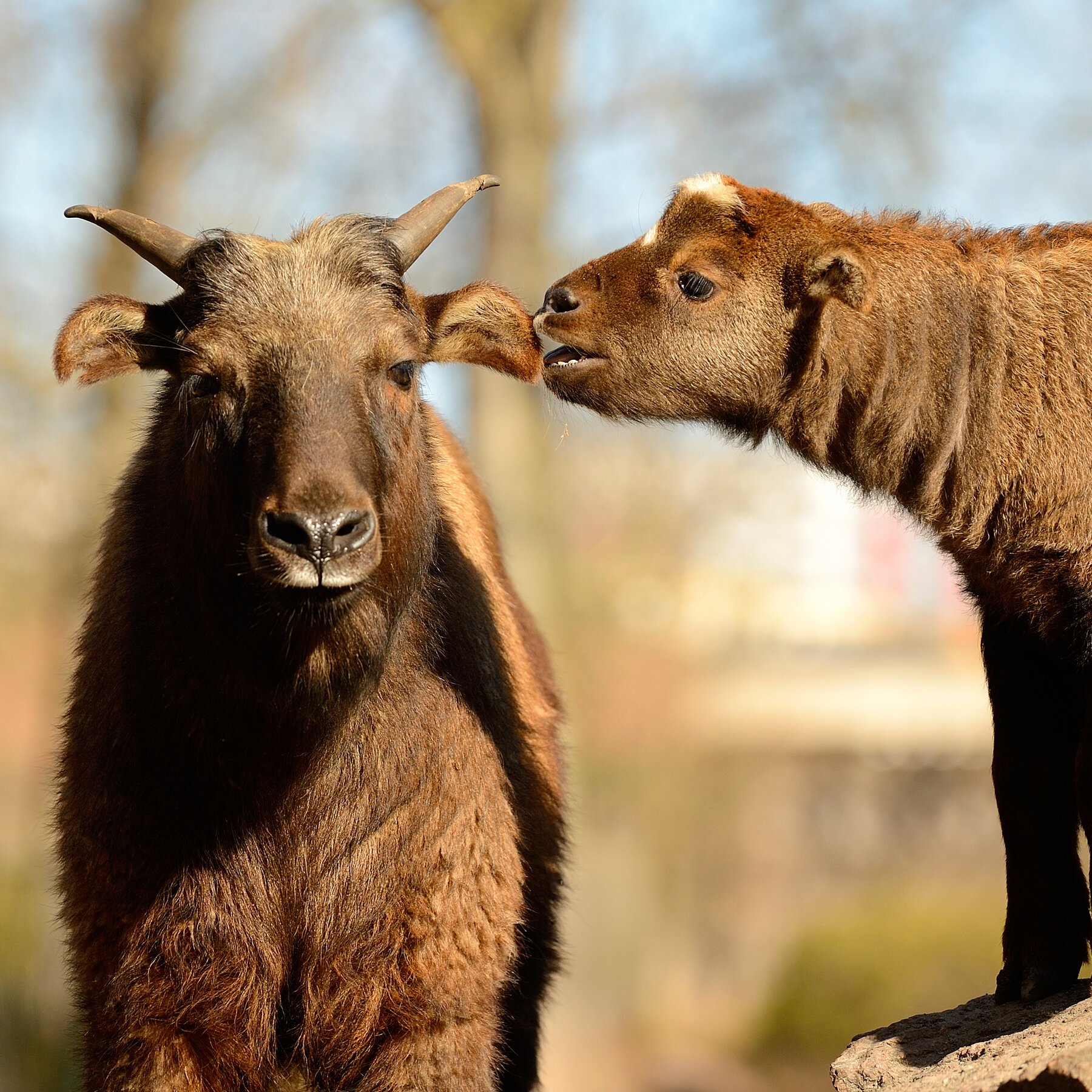 Eines der Auswahlkriterien für die Tierarten, die wir bei uns halten ist ihr Bedrohungsstatus. Die Aufgabe von Zoologischen Gärten wird oft anhand der Metapher der Arche erklärt, auf der vor allem die vom Aussterben bedrohten Tiere Zuflucht finden sollen. Die Gold-, Sichuan- und Mishmi-Takine sind - laut Roter Liste der IUCN - alle drei gefährdet. Die IUCN berücksichtigt bei der Beurteilung der Bedrohung aber nicht nur Arten, sondern gerade bei Säugetieren in einigen Fällen auch Unterarten. So wird das nördliche Breitmaulnashorn beispielsweise sehr bald für ausgestorben erklärt werden, während der Bestand des südlichen Breitmaulnashorns derzeit „nur“ potentiell gefährdet ist.
