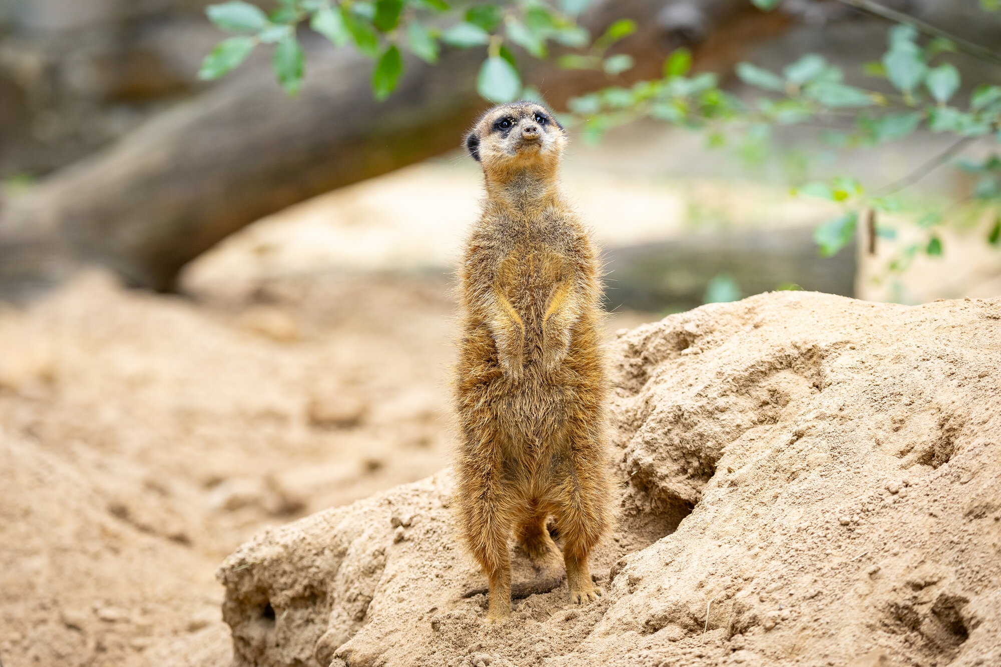 Die quirligen Erdmännchen leben in engen Familienverbänden und sind geschickte Buddler. Angeführt wird die Gruppe von einem Weibchen. Ein Erdmännchen der Gruppe hält immer Wache. So kann der Rest der Großfamilie in Ruhe auf Beutezug gehen oder faul in der Sonne herumliegen. Nähern sich Feinde wie Schakale oder Greifvögel, stoßen die kleinen Wachmänner ein schrilles Pfeifen aus und der Rest fegt in die Höhlen.