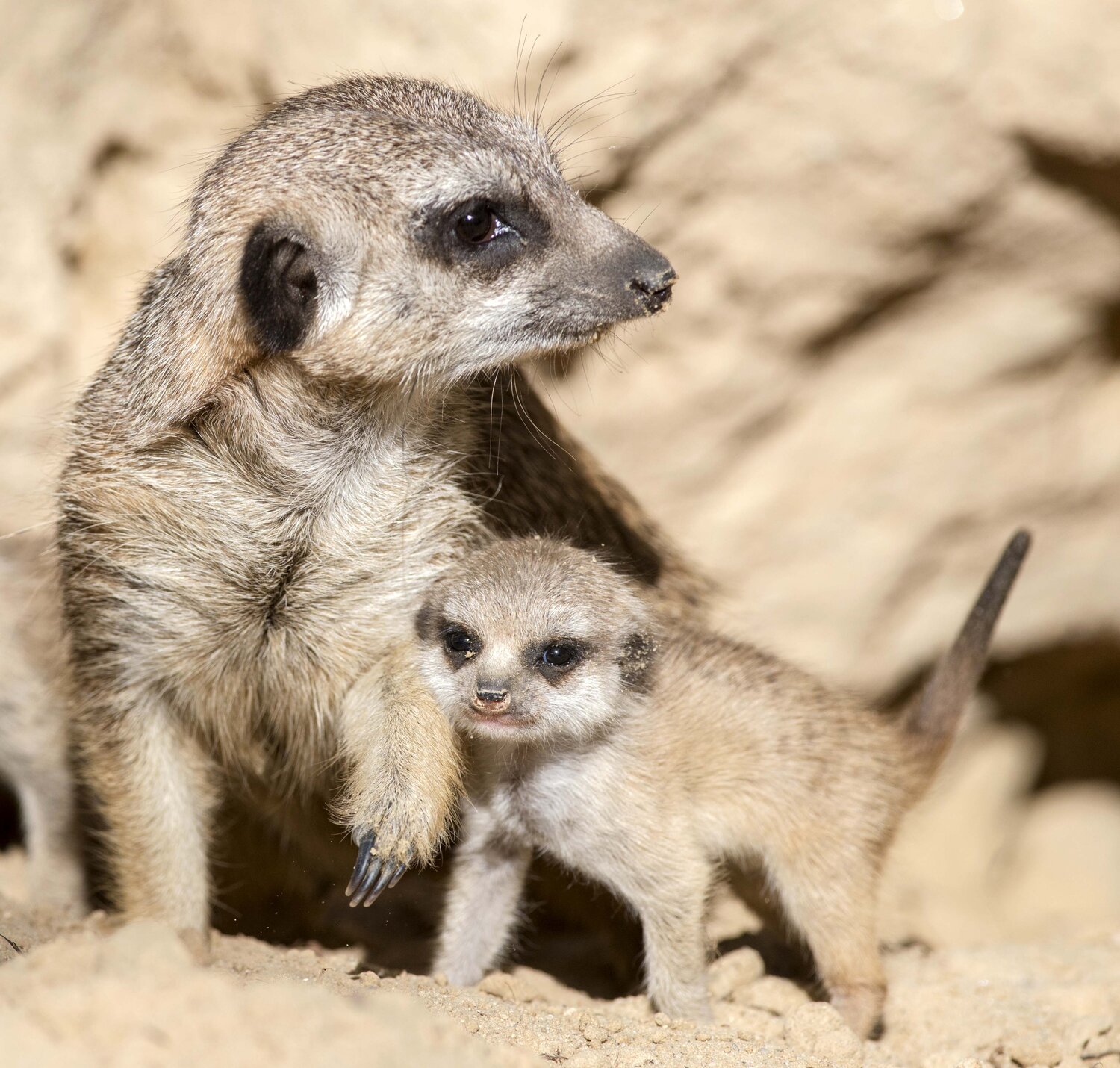 Das Erdmännchen Eddi im Zoo drängt sich mit vollem Körpereinsatz zwischen die drolligen Neuankömmlinge. Mit schnüffelnder Schnauze versucht er sich gegen seine kleinen Geschwister zu behaupten und den begehrten Kuschelplatz bei Mutter Nanni (2) zu besetzen. Vergeblich – am Ende setzen sich die am 5. Mai geborenen Winzlinge durch und kuscheln sich gemeinsam an Mamas weichen Bauch. Lange war es still im Hause Erdmann, doch mit dem ersten Nachwuchs nach sieben Jahren war es mit der Ruhe schlagartig vorbei. Vier Jungtiere riskierten im kalten Januar das erste Mal einen Blick aus ihrer Höhle und kaum ein halbes Jahr später wächst die Familie weiter: Sechs Jungtiere tollen mit ihren vier großen Geschwistern nun um die Wette. Was für andere Mütter der absolute Ausnahmezustand wäre, ist bei Erdmännchen allerdings ganz normaler Alltag.