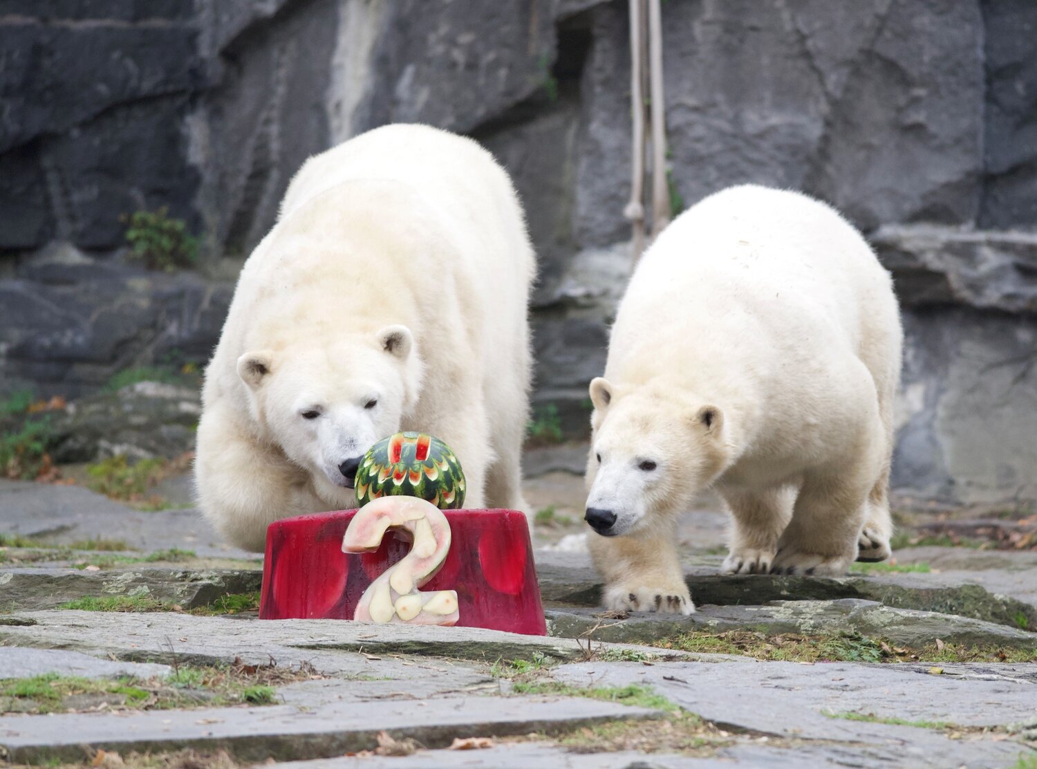 Vom meerschweinchengroßen, hilflosen „Würmchen“ bis hin zur 180 kg schweren Bären-Teenagerin – in den letzten zwei Jahren hat Eisbärin Hertha im Tierpark Berlin eine beachtliche Entwicklung hingelegt. Natürlich durfte sich die beliebte Bärin an ihrem Ehrentag wieder über eine besondere Überraschung freuen: In liebevoller Handarbeit bauten die Azubis des Tierparks eine Eistorte, bestückt mit Birne und Melone. Dazu gabs leckeren Fisch.