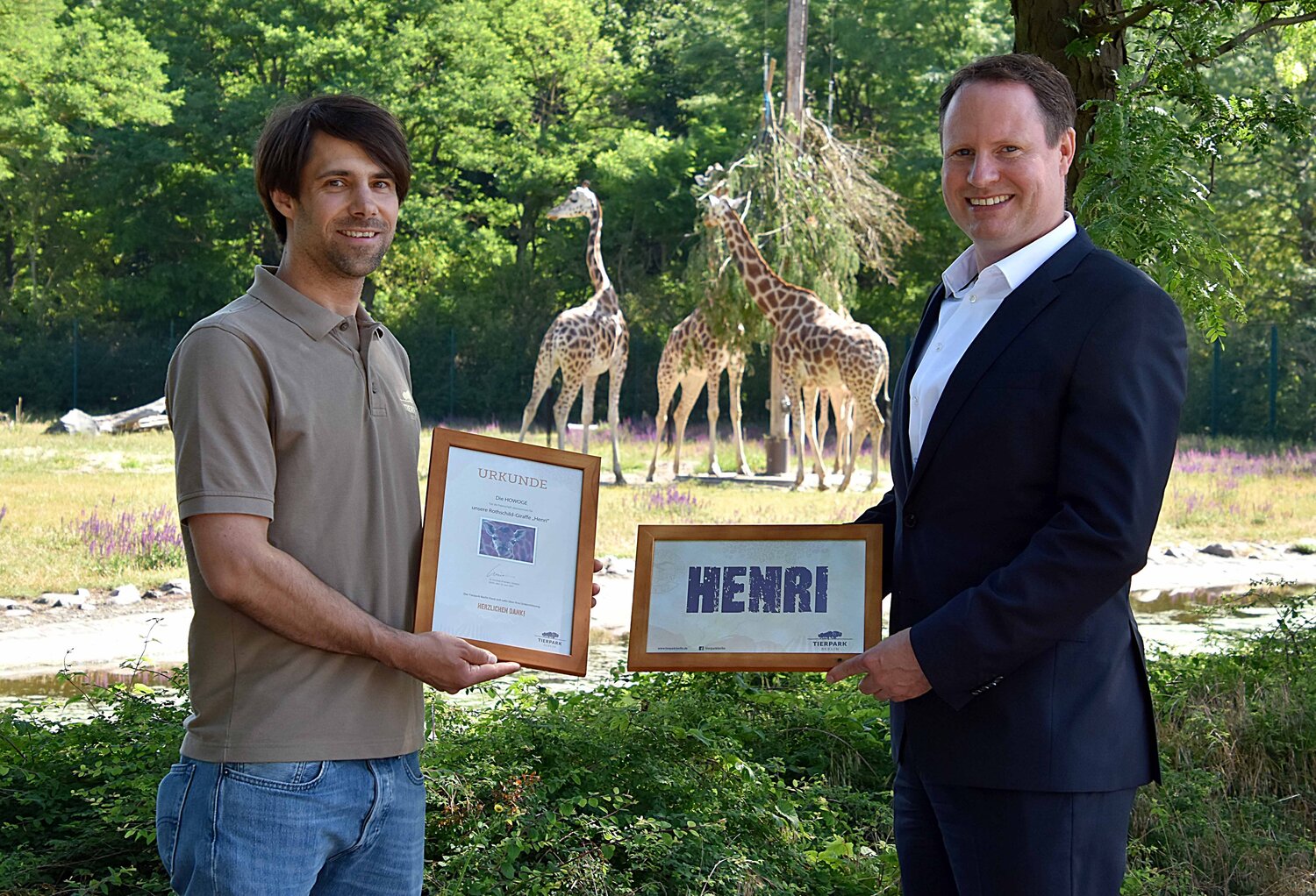 Mit zögerlichen Schritten folgt der junge Giraffenbulle seiner Herde und betritt dicht an der Seite seiner Mutter Amalka (6 Jahre) erstmals das grüne Gras. Seine anfängliche Schüchternheit hat er jedoch schnell überwunden. Nachdem Ella ihrem kleinen Bruder scheinbar noch etwas Mut zugesprochen hat, galoppiert er schon bald ausgelassen umher. Seit heute hat das jüngste Familienmitglied der Berliner Langhälse auch einen Namen. „Wir haben uns aus hunderten von Vorschlägen für den mehrfach genannten Namen Henri entschieden – er ist kurz, knackig und passt sehr gut zu Schwester Ella“, verkündet Ulrich Schiller, Geschäftsführer der Wohnungsbaugesellschaft HOWOGE, dem langjährigen Paten der Giraffenherde. „Wir freuen uns über den munteren Neuzugang und sind stolz, den Tierpark Berlin bei seinem Engagement für den Schutz dieser faszinierenden Tiere unterstützen zu können.“