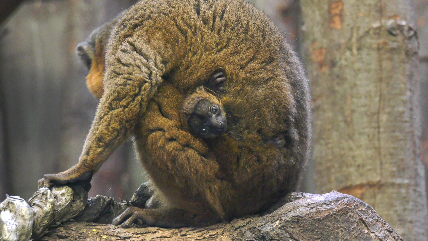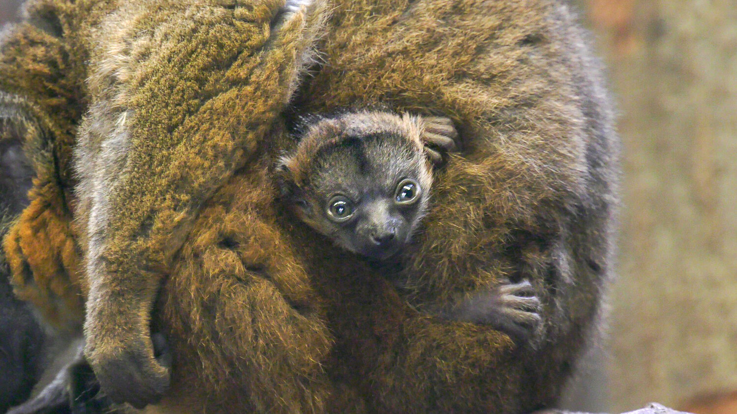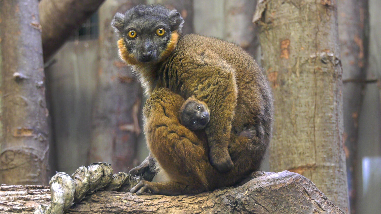 Mit festem Griff hält sich das Jungtier in der Schenkelbeuge seiner Mutter Elodie (3 Jahre) fest. Rund um die Uhr ist das kleine Äffchen im Körperkontakt mit seiner Mutter, nur ab und zu lugt der kleine Kopf aus dem roten Fell der Mutter hervor. Nach rund 120 Tagen Tragzeit kam das bislang noch namenlose Jungtier am 9. April 2021 zur Welt. Nach seiner Mutter Elodie ist der kleine Affe erst der zweite in Deutschland geborene Halsbandmaki überhaupt. „Als einziger Halter Deutschlands haben wir eine besondere Verantwortung für diese seltene Tierart. Wir stehen daher mit anderen Einrichtungen weltweit im Austausch, eines unserer Tiere ist im Rahmen des Erhaltungszuchtprogramms sogar nach New York City gezogen“, erklärt Zoo und Tierpark-Direktor Dr. Andreas Knieriem. Im natürlichen Lebensraum sind die kleinen Primaten bedroht. Die Hauptgefahr für den Halsbandmaki stellt die Zerstörung seines Lebensraums durch Brandrodungen und Holzkohleerzeugung dar, auch illegale Wilderei hat die Bestände drastisch reduziert. Die Weltnaturschutzunion IUCN schätzt, dass die Gesamtpopulation in den letzten drei Jahrzehnten um mehr als 30 % zurückgegangen ist und listet die Art daher als stark bedroht.