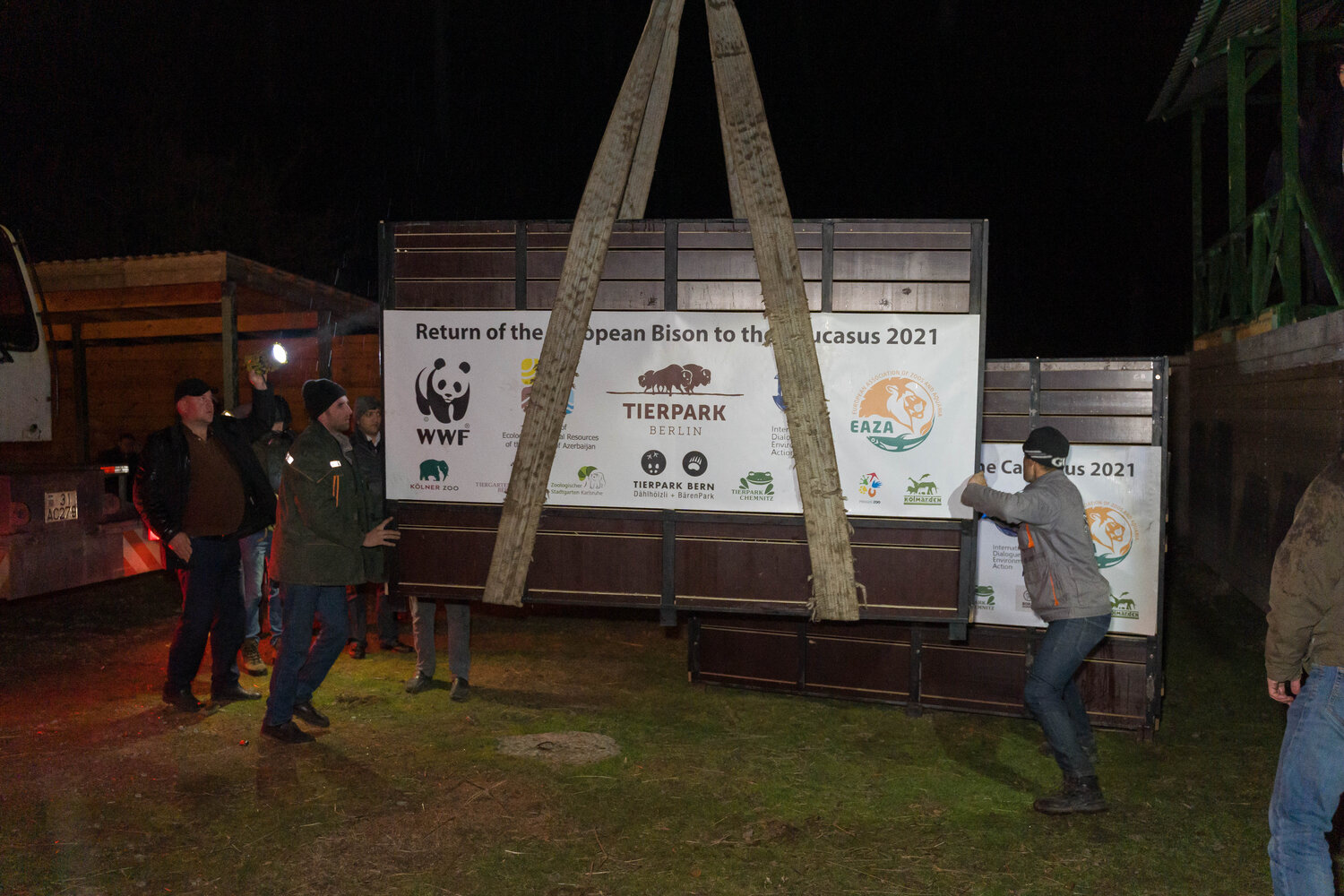 In den vergangenen Monaten waren im Rahmen des Erhaltungszuchtprogramms des Europäischen Zooverbandes EAZA sieben Wisente aus den Zoologischen Gärten Kolmarden und Boras (Schweden), Prag (Tschechische Republik) sowie Chemnitz, Köln, Bernburg und Karlsruhe (Deutschland) in den Tierpark Berlin gezogen. Nachdem die Tiere reichlich Zeit hatten sich aneinander zu gewöhnen, reiste die Berliner Wisent-Herde nun in einer Frachtmaschine ab Frankfurt mit einem One Way Ticket nach Baku. Zwei weitere Tiere aus dem Tierpark Bern werden in Aserbaidschan mit den sieben Berliner Wisenten vereint. Begleitet wurde die Reise u.a. von Dr. Florian Sicks, Stellvertretender Leiter des Tierpark Berlin: „Für mich persönlich war der Flug in der Frachtmaschine vermutlich genauso aufregend wie für die Wisente. Glücklicherweise haben wir alle die Reise gut überstanden“, berichtet er. Um sich an ihre neue Heimat zu gewöhnen, werden sich die Wildrinder dort zunächst in einem Eingewöhnungsareal aufhalten. Da einzelne Wisente im Vorfeld mit modernen GPS-Halsbändern ausgestattet wurden, wird die Herde auch zukünftig weiter begleitet werden. „Wir sehen es nicht nur als unsere Aufgabe, die Gäste von Zoo und Tierpark für die Tierwelt zu begeistern, sondern betreiben auch aktiv Artenschutz. Sei es durch Unterstützung unserer Partnerprojekte durch Ressource und Expertise oder – wie beim Wisent – mit der gezielten Auswilderung unserer Berliner Tiere“, erklärt Zoo- und Tierpark-Direktor Dr. Andreas Knieriem.