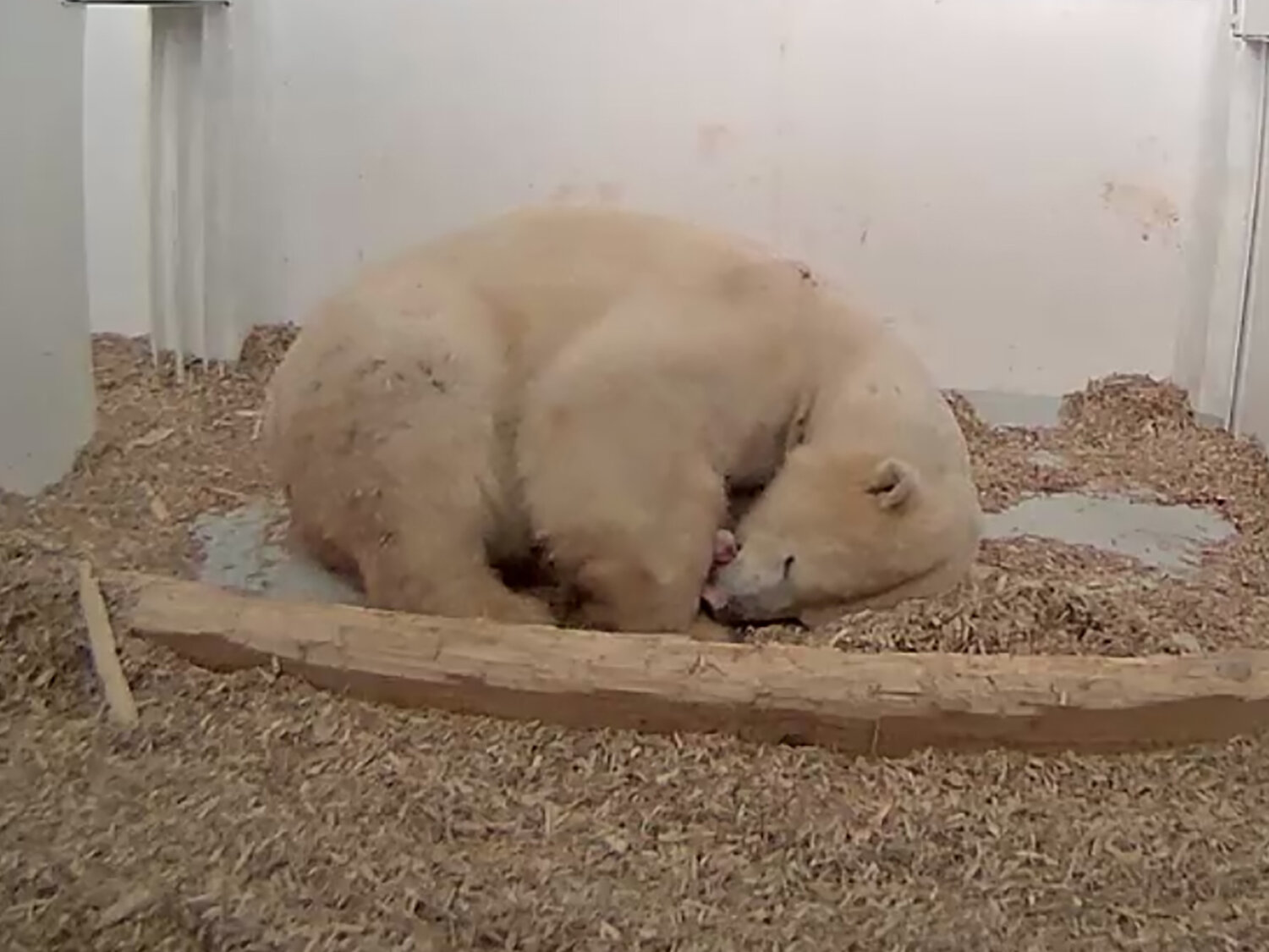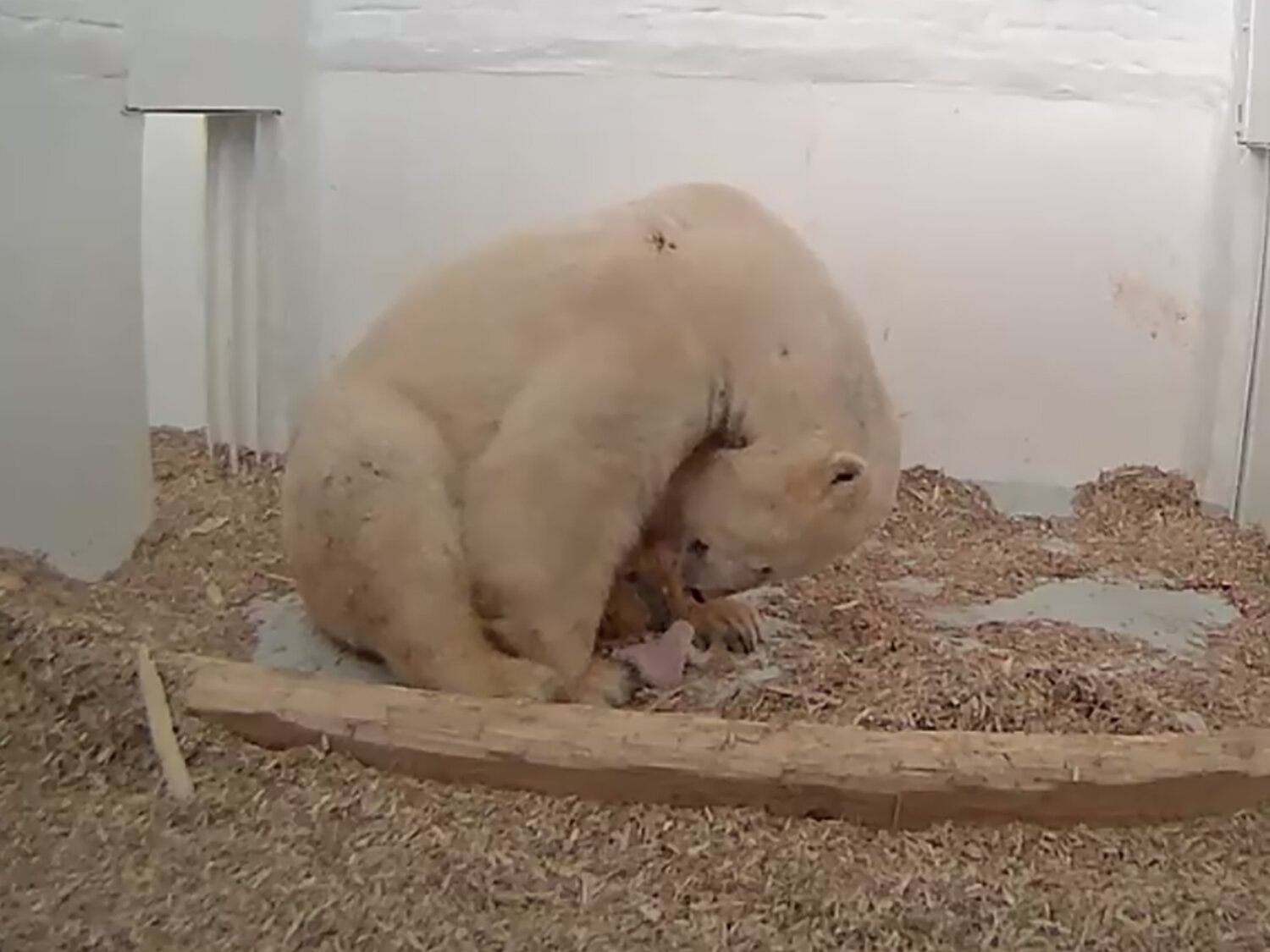 Noch hat das vier Tage alte Jungtier die kritische Phase der ersten zehn Tage nicht überstanden, doch Eisbärin Tonja kümmert sich liebevoll um ihren Nachwuchs. Sobald Mutter Tonja einmal aufsteht, um ihre Liegeposition zu wechseln, protestiert es lautstark – liegt es kurz darauf im kuscheligen Fell seiner Mutter, ist die Welt wieder in Ordnung. Währenddessen genießt Eisbären-Vater Wolodja auf der Außenanlage den ersten richtigen Schnee in diesem Winter.
