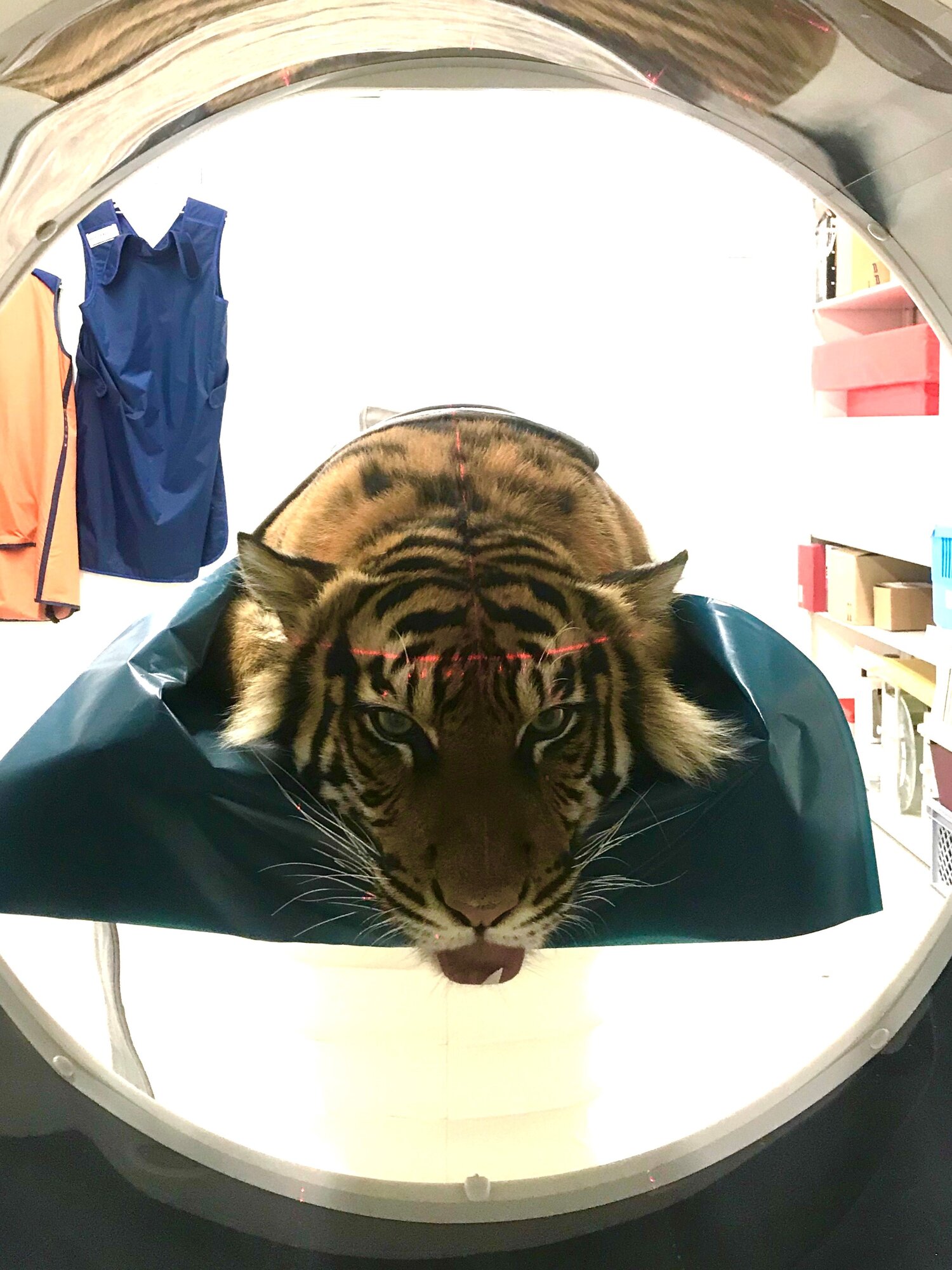 Sumatra-Tiger gehören zu den seltensten Katzen der Erde. Daher war die Euphorie groß, als Tigerin Mayang im Sommer 2018 vier Jungtiere zur Welt brachte. Die Freude wurde jedoch getrübt, als sich bei den Jungtieren Auffälligkeiten im Laufverhalten zeigten. Ende 2019 stellte sich anhand von CT-Untersuchungen im benachbarten Leibniz-Institut für Zoo- und Wildtierforschung (IZW) heraus, dass die Sumatra-Tiger-Vierlinge eine Kniefehlstellung und damit einhergehende Knorpelschäden haben, welche dazu führen, dass die jungen Tiger beim Laufen mit ihren Hinterbeinen einknicken.