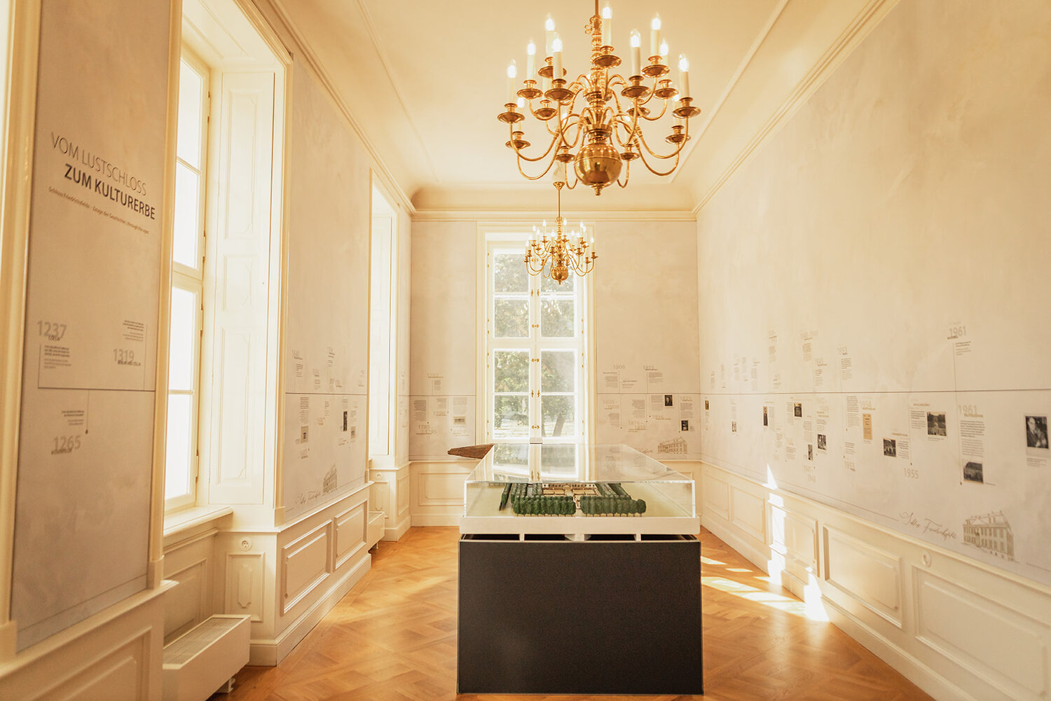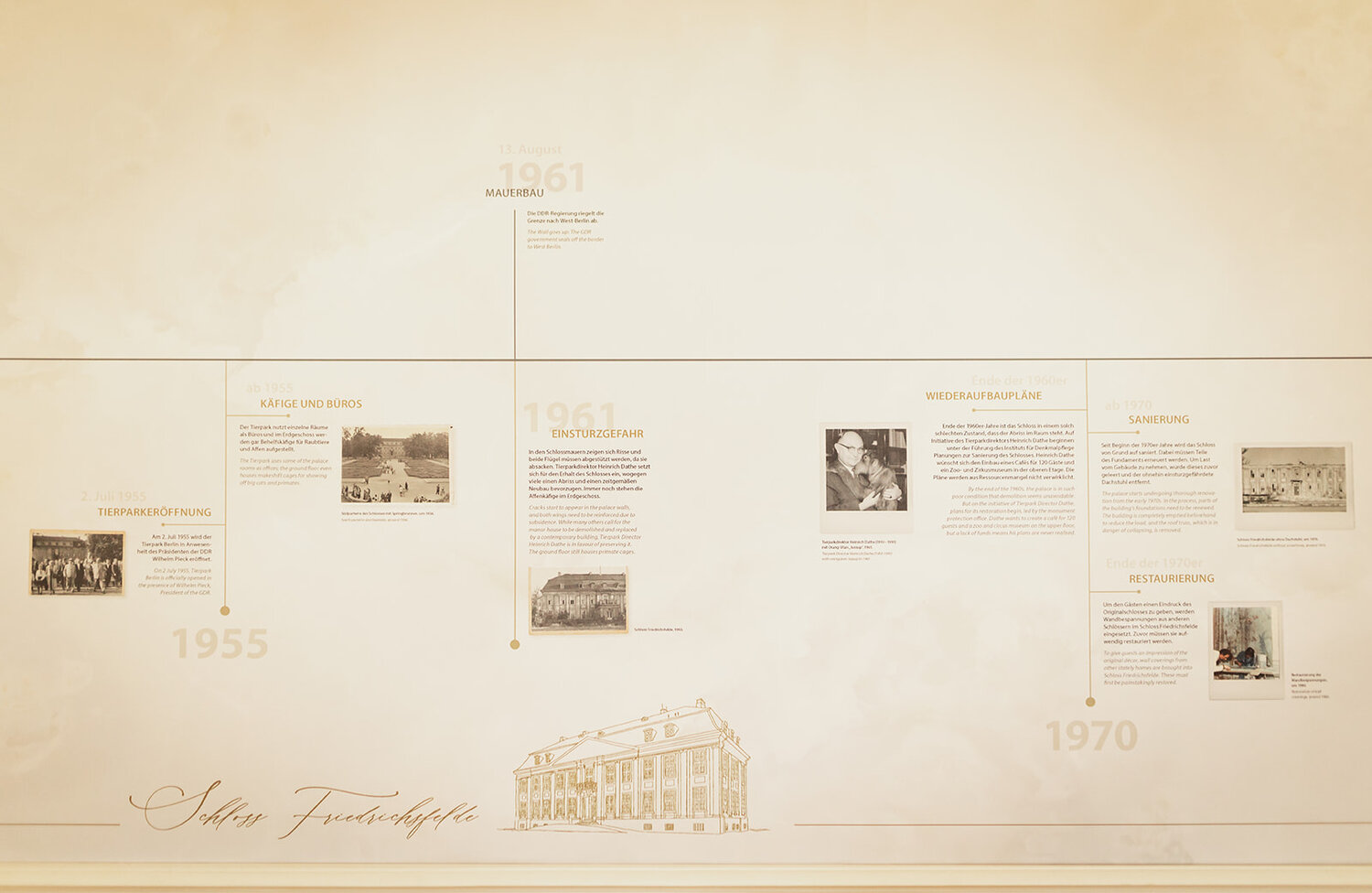 Nachdem das Schloss Friedrichsfelde coronabedingt seit Herbst 2020 geschlossen bleiben musste, eröffnet es nun wieder seine Pforten für Besucher*innen – mit einem neuen Highlight. Im „Geschichtszimmer“ des Ostflügels führt eine neue Ausstellung die Gäste nicht nur durch die bewegte, fast 400-jährige Historie des Schlosses, sondern gibt auch spannende Einblicke in die Geschichte Berlins - beginnend 1237 mit der ersten urkundlichen Erwähnung von Cölln, einer der beiden Gemeinden, die Berlin begründeten. Vor allem beleuchtet die Ausstellung aber alle wichtigen Meilensteine des Schloss Friedrichsfeldes in den darauffolgenden Jahrhunderten, seinem Bau, den Erweiterungen, Plünderung, Zerfall und Wiederaufbau. In seiner jetzigen Gestalt präsentiert sich Friedrichsfelde als frühklassizistisches Schloss. Es wurde jedoch bereits 1685 erbaut und erlebte in seiner wechselvollen Geschichte zahlreiche Schlossherren. Zuletzt im Besitz der Familie von Treskow, deren letzte Ruhestätte in der Nähe der Eisbärenanlage liegt, wurde es im Mai 1945 von sowjetischen Truppen besetzt, bevor es Dank Professor Dathe 1955 ein „gewichtiges Wahrzeichen“ des neu eröffneten Tierparks wurde. Die 1967 begonnenen Restaurierungsarbeiten wurden mit der feierlichen Neueröffnung am 11. Juni 1981 vollendet. Erst durch die Gründung des Tierpark Berlin wurde eine Sicherung und Rekonstruktion möglich, sodass es nun wieder in seinem alten Glanz erstrahlt. Im Inneren schmücken historische Wandbespannungen und Malereien das Schloss. Die neue Ausstellung hat der Historiker Dr. Clemens Maier-Wolthausen kuratiert, der auch bereits die 175-Jährige Geschichte des Zoo Berlin im Rahmen einer Dauerausstellung sowie eines Buches aufgearbeitet hat. „Ich freue mich, dass das Schloss Friedrichsfelde als kulturelles Herzstück des Tierpark Berlin nun wieder geöffnet ist und wir unseren Gästen hier eine informative und zeitgemäße Ausstellung zur Geschichte dieses Hauses präsentieren können“, begrüßt Zoo- und Tierparkdirektor Dr. Andreas Knieriem die Wiedereröffnung. „Neben unzähligen Skulpturen und architektonischen Denkmälern in einer weitläufigen Parklandschaft, macht vor allem dieses historische Bauwerk mit seiner wechselvollen Geschichte und einem vielfältigen Veranstaltungsprogramm den Tierpark Berlin zu einem Ort, an dem Natur und Kultur auf ganz besondere Weise aufeinandertreffen.“