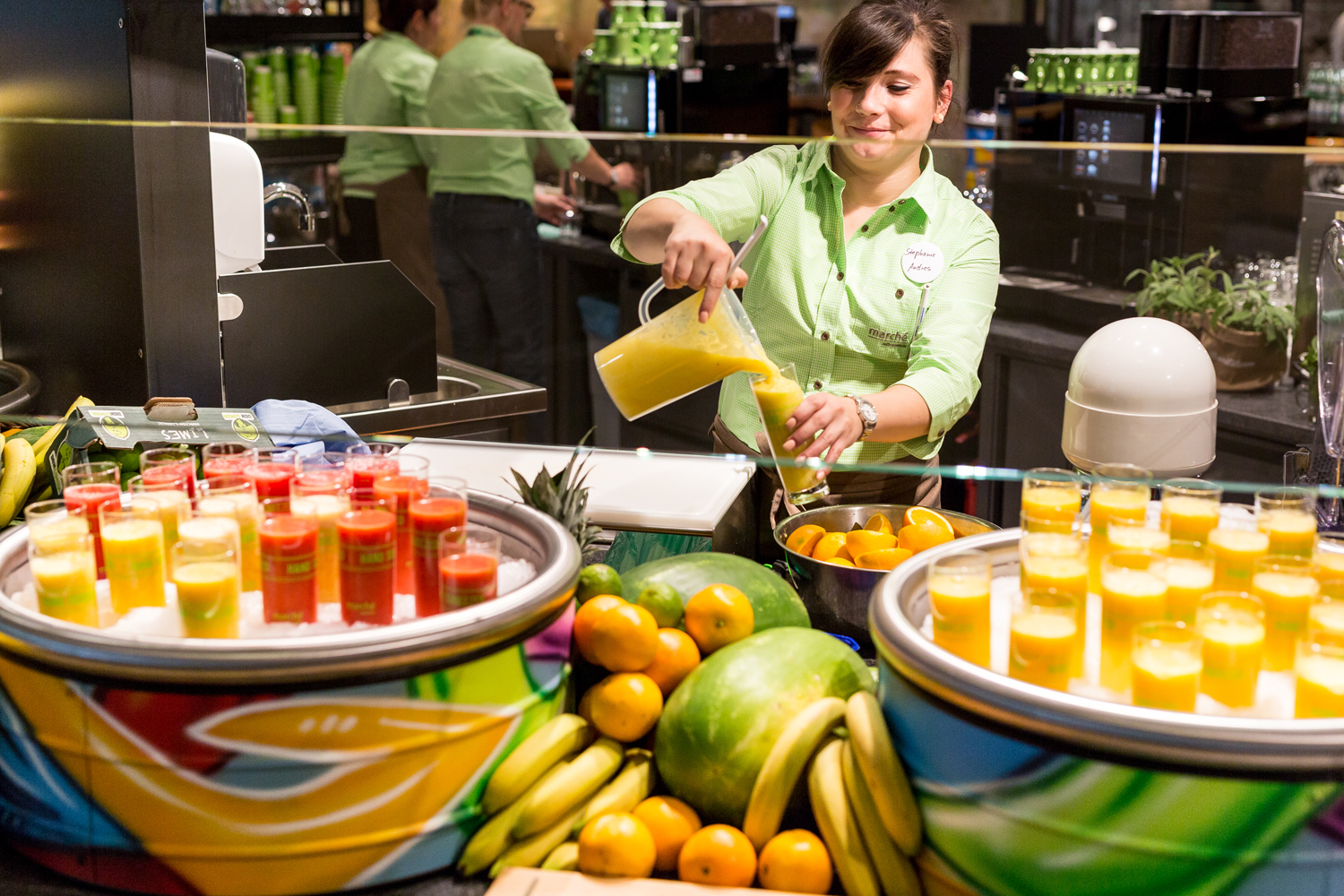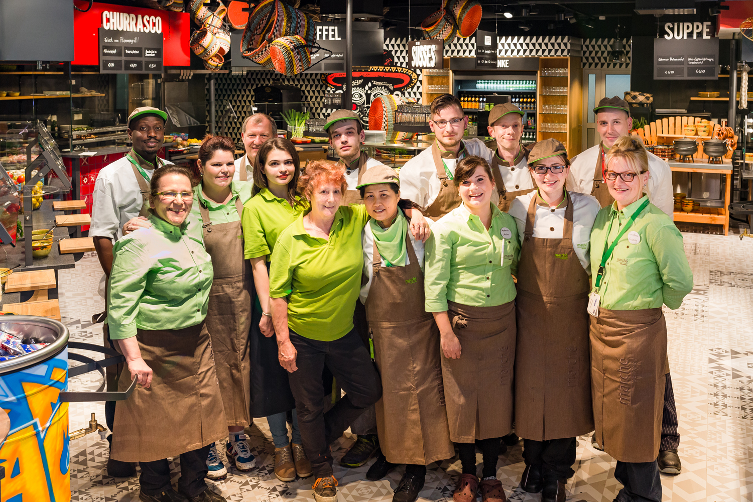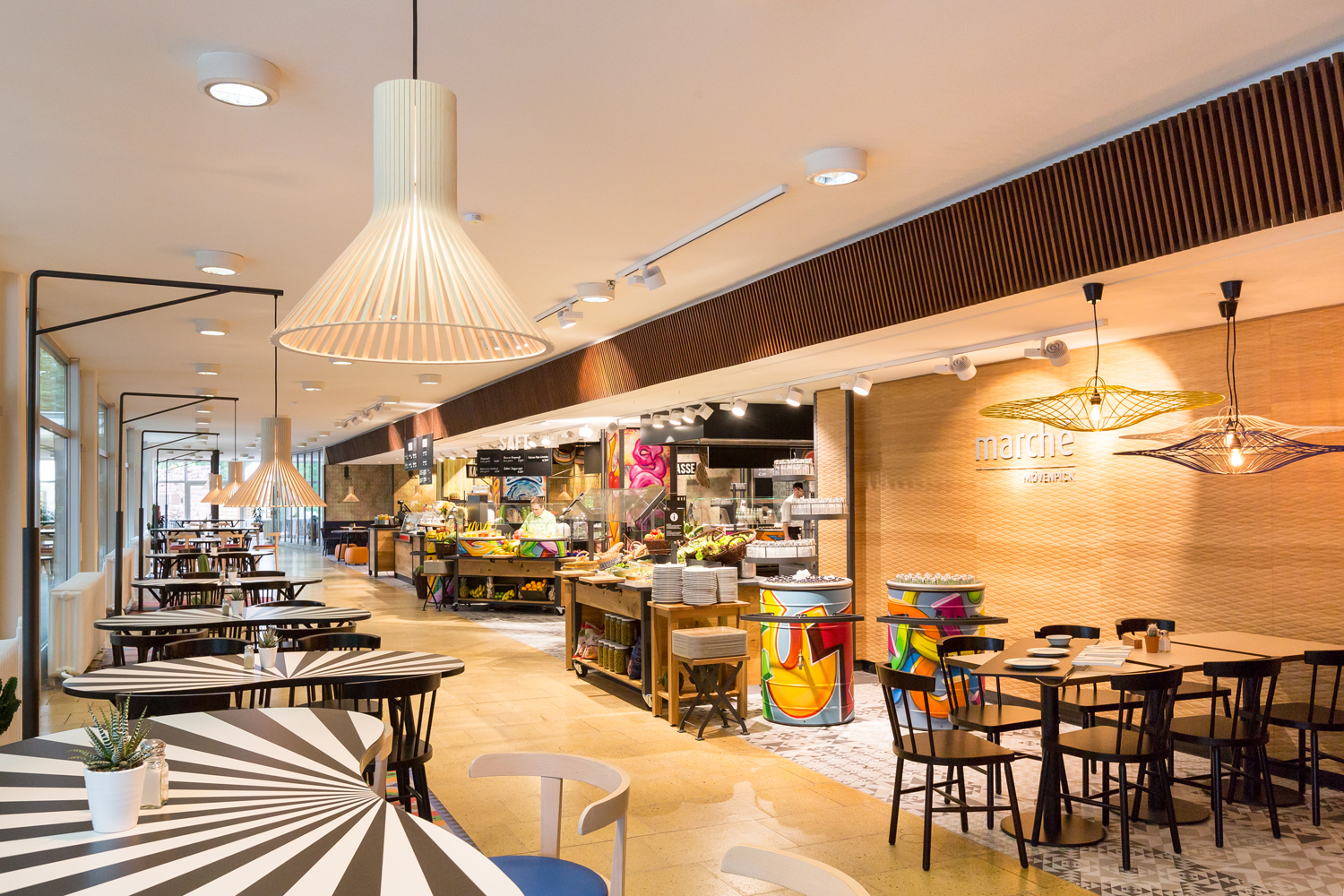 Das neue Angebot bietet viel Abwechslung: südamerikanische Spezialitäten vom Churrasco Grill, wie frisch marinierte Fleischspieße, Fisch, Geflügel, Rind und Schwein sowie frische Salate und ein Gemüsebuffet. Unter dem Motto „Lieblingsessen“ werden u.a. Berliner Klassiker wie eine Pfannenboulette mit Markterbsen und Stampfkartoffeln geboten. Frisch gepresste Säfte, hausgemachte Limonaden und erfrischende Eistees stehen u.a. auf der Getränkekarte. Neben Mövenpick Bio/Fairtrade Kaffee- und Tee-Spezialitäten serviert Marché Mövenpick hausgemachte Pâtisserie und köstliche Eisbecher.
