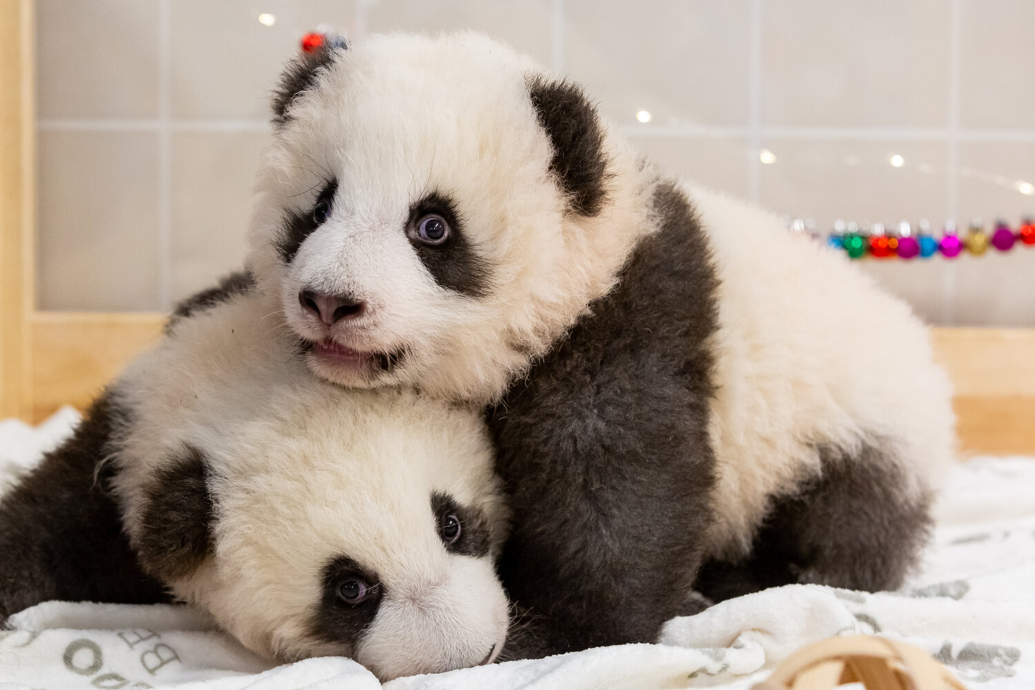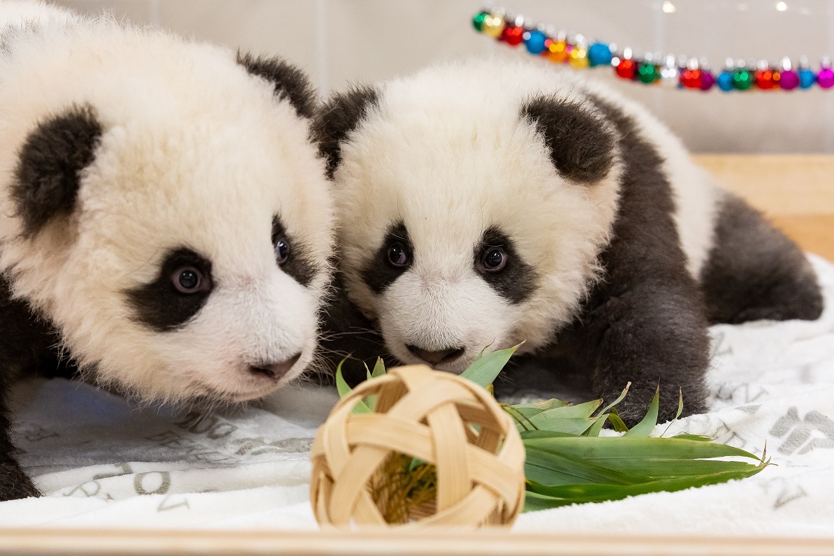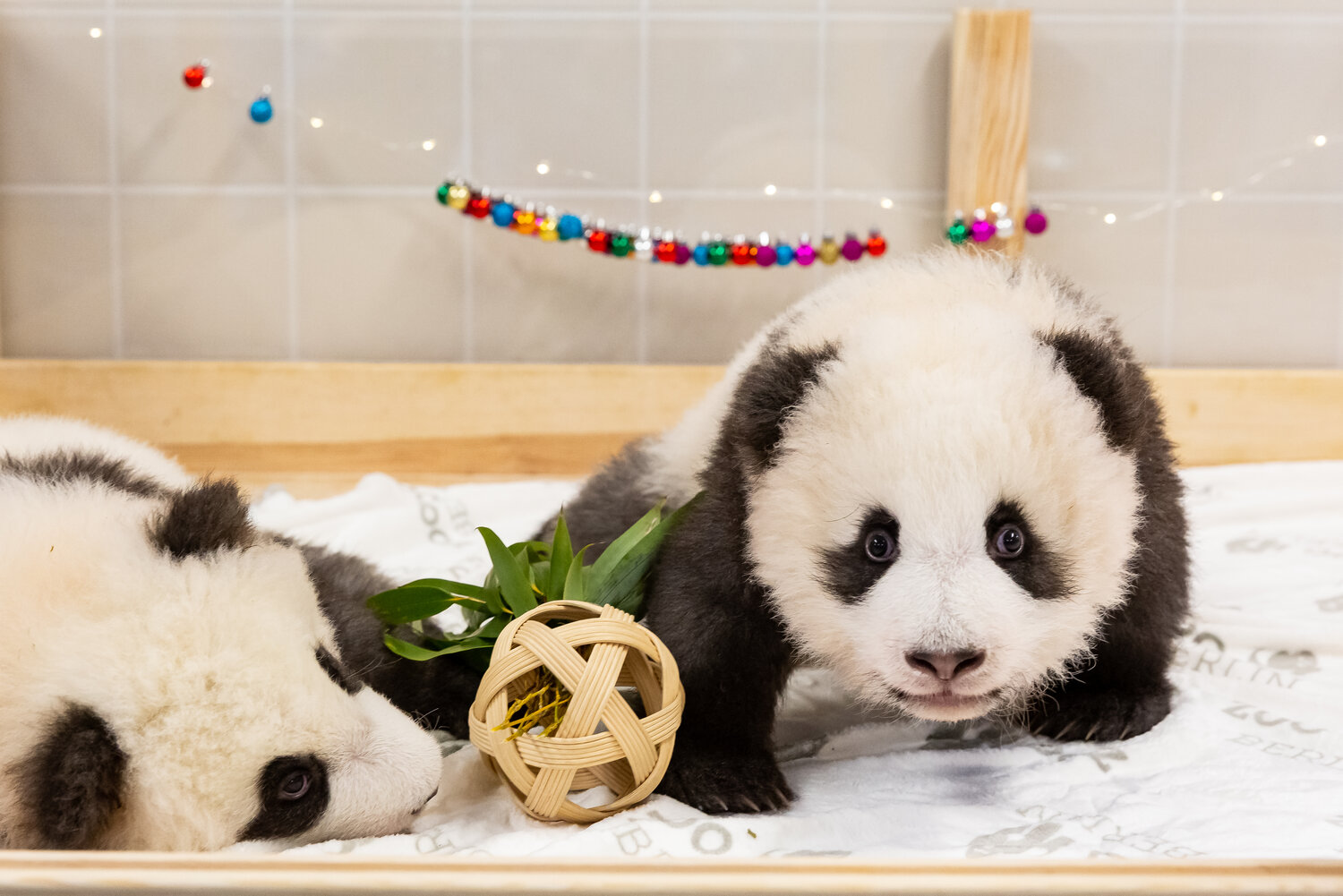 Ein ganz besonderer Tag für die Panda-Jungs im Zoo Berlin: Die Zwillinge wurden von den Tierpflegern mit ihrem ersten Spielzeug überrascht. Neugierig hebt der kleine Panda Meng Xiang seinen Kopf und begutachtet den mit saftigen grünen Bambusblättern gefüllten Weidenball. Der deutlich aktivere der Panda-Jungtiere Meng Yuan perfektioniert seine Fortbewegung und quert erstmals auf wackeligen Beinen das Pandabettchen. Mittlerweile bringen die Zwillinge 7.140 g (Meng Xiang) bzw. 6.866 g (Meng Yuan) auf die Waage. Anfang des kommenden Jahres werden die kleinen Pandas gemeinsam mit Panda-Mama Meng Meng den ersten Ausflug vor den Augen der Besucher wagen. Es wird also nicht mehr lange dauern, bis die beiden zusammen über die Anlage flitzen.