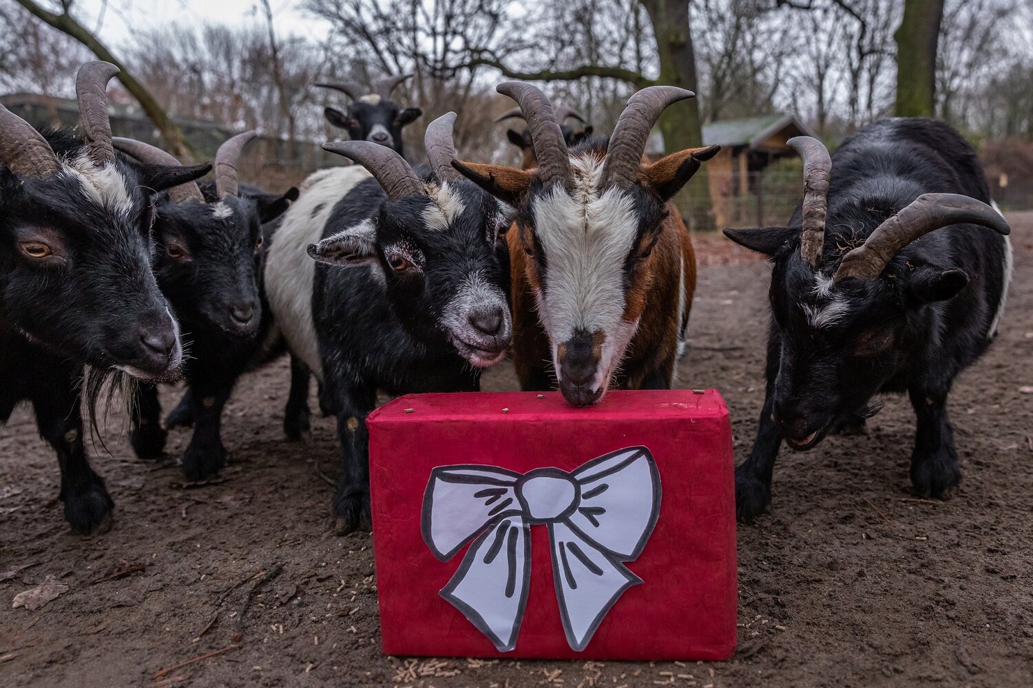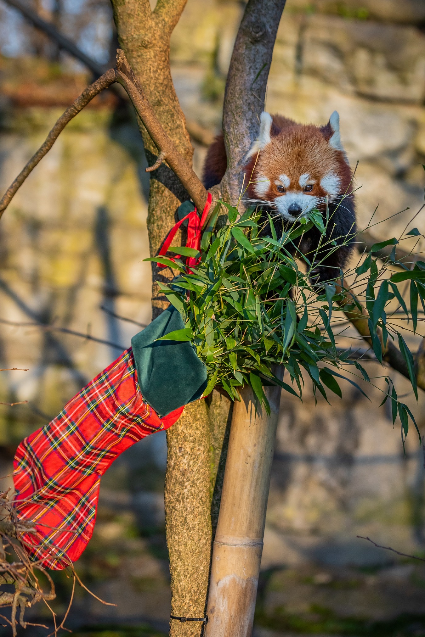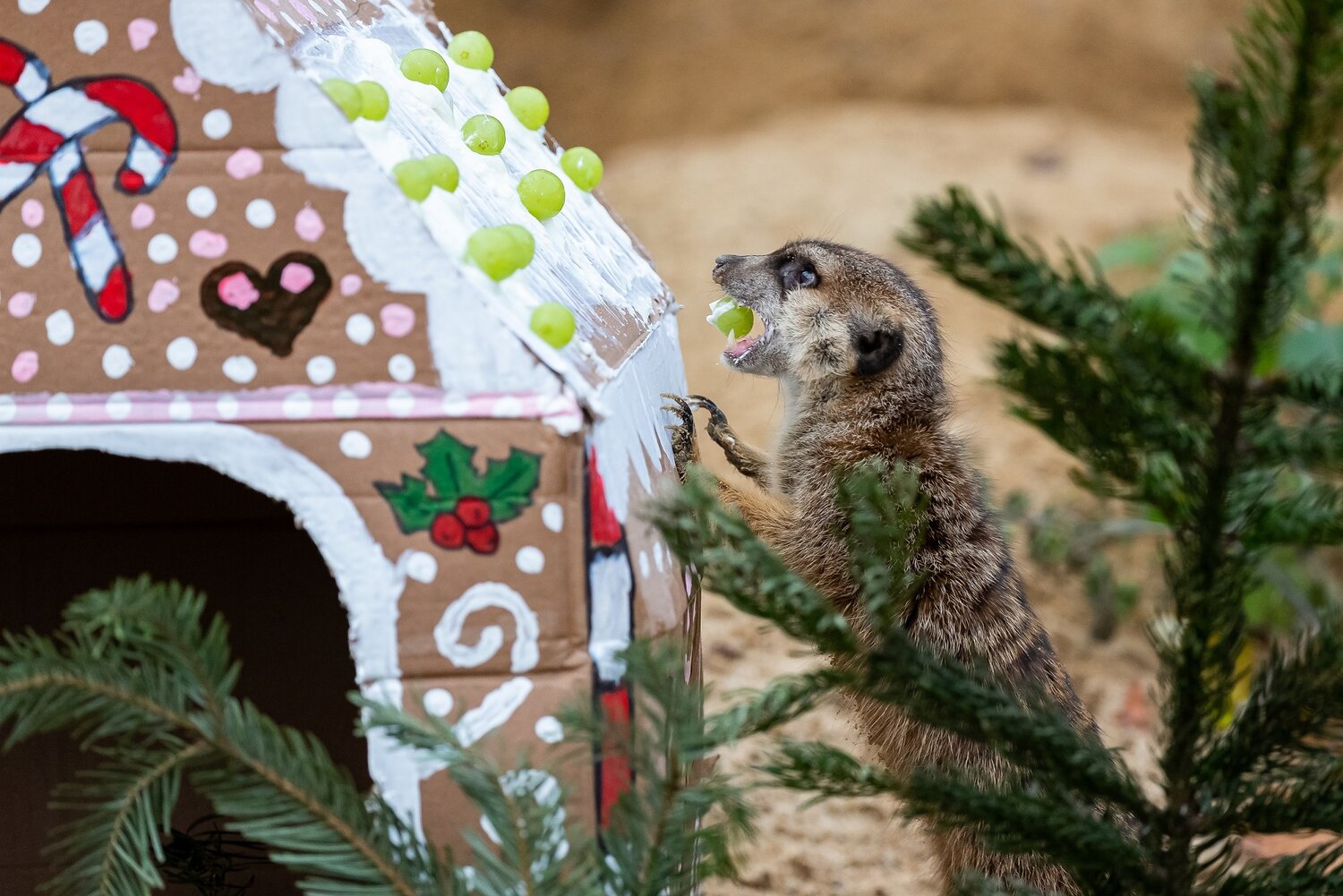 Aber auch einige andere Zoo-Bewohner dürfen sich in diesen Tagen über weihnachtlich-winterliche Aufmerksamkeiten freuen. Die Erdmännchen sind anlässlich ihrer Überraschung freudig aufgeregt. Ein garantiert zuckerfreies Lebkuchenhaus haben die Tierpfleger mit Quark und leckeren Weintrauben geschmückt – es scheint zu schmecken. Für die Seehunde kommt das Futter in diesen Tagen aus einem roten Weihnachtsstiefel. Natürlich wusste der „Weihnachtsmann“ (in Tierpfleger-Montur) genau, womit er den speckigen Meeressäugern eine Freude macht: Fisch!