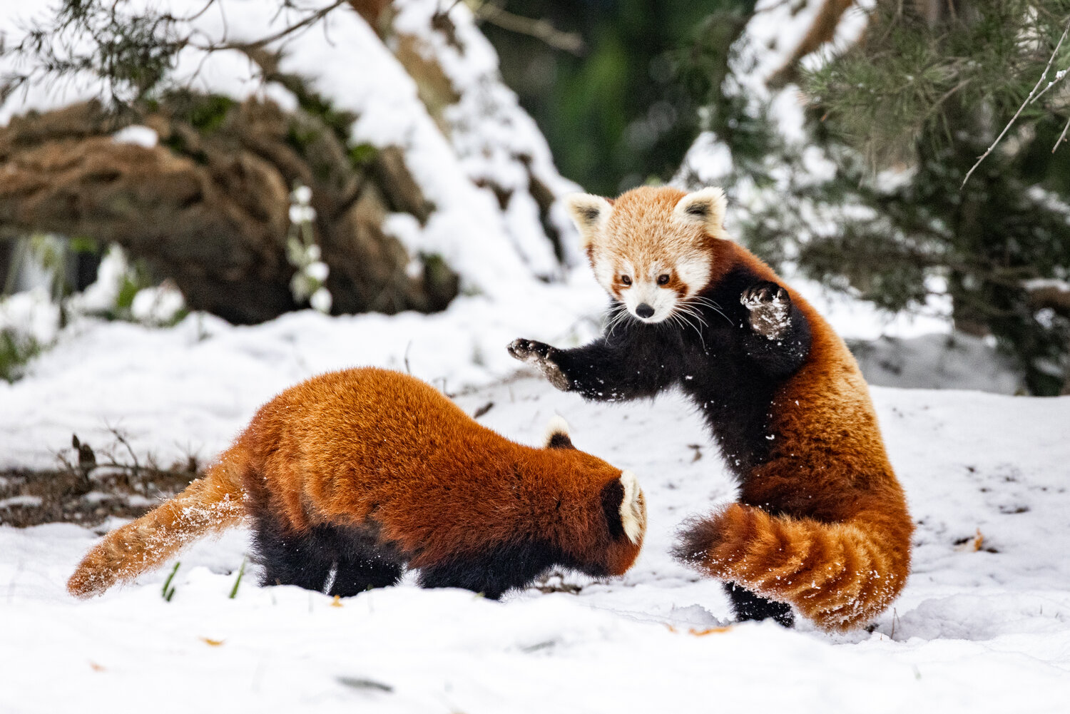 Für unsere Roten Pandas kein Problem! Denn die Katzenbären, wie die kleinen Tiere auch genannt werden, haben dichte Haare an den Sohlen ihrer Pfoten – und die wärmen nicht nur bei Eis und Schnee, sondern sorgen auch für eine hervorragende Antirutschbeschichtung.