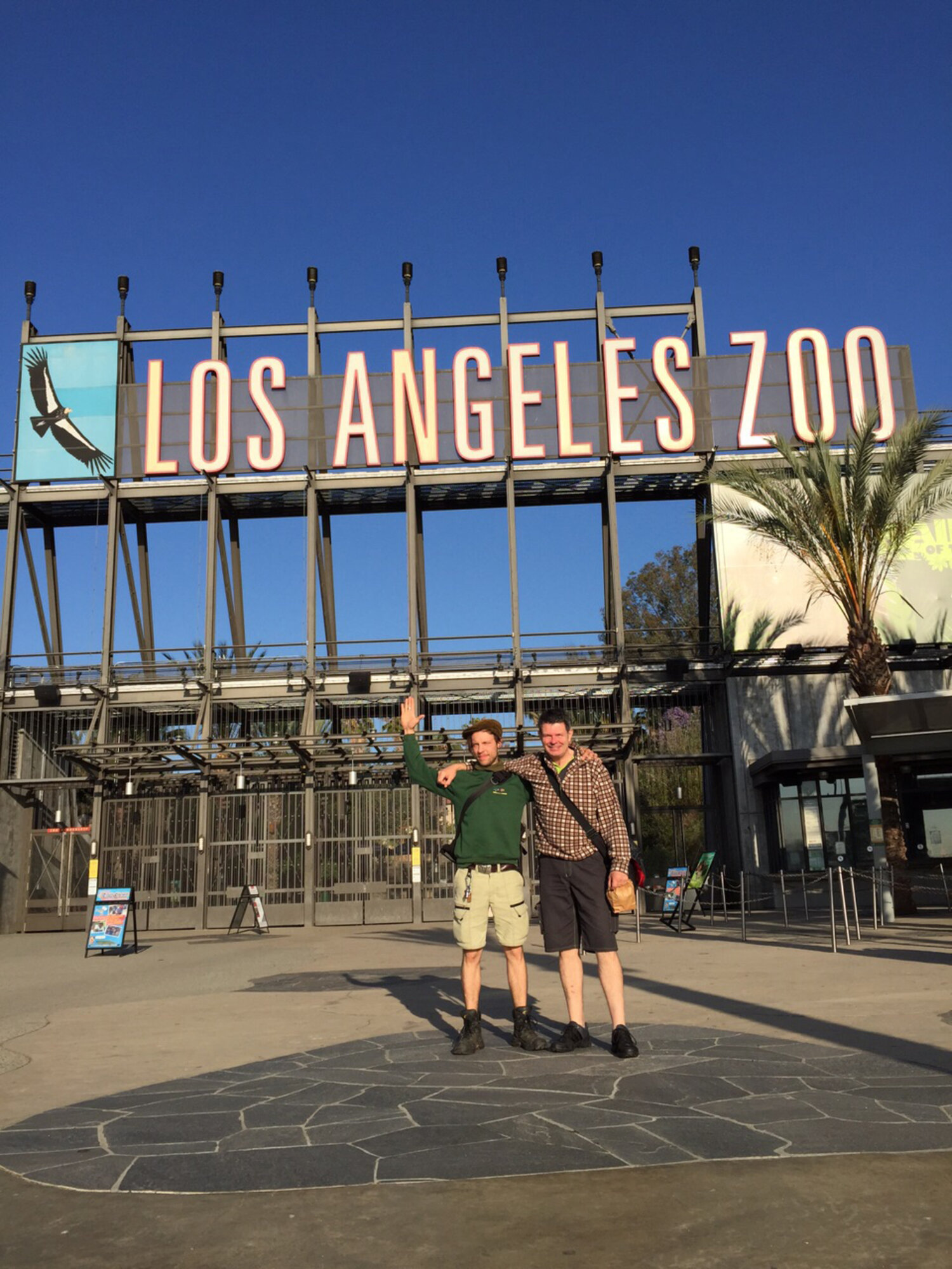 Mitte Mai ging es für Christian Aust, Tierpfleger bei den Menschenaffen im Zoo, und Nico Astor, Tierpfleger in der Tropenwelt des Tierpark Berlin, auf zweiwöchige Mission nach Los Angeles. Vor Ort wurde direkt mit angepackt – jeder der Pfleger in seinem gewohnten Revier – ausmisten, Gehege säubern, kommentierte Fütterungen stehen natürlich auch in Los Angeles auf dem Arbeitsplan. „Die Menschenaffenbereiche im Zoo L.A. sind relativ überschaubar. Aufgrund des durchgehend milden Klimas gibt es jedoch besonders große Außenanlagen und nicht so viele Tierhäuser wie in Europa“, berichtet Tierpfleger Christian Aust. Und fügt amüsiert hinzu: „Besonders beeindruckend war die Tatsache, dass aufgrund der Lage des Zoo L.A. das Futter für die Affen quasi im Park vor der Tür gesammelt werden kann.“ Mit vielen neuen Eindrücken ging es nach zwei Wochen zurück in die Heimat.