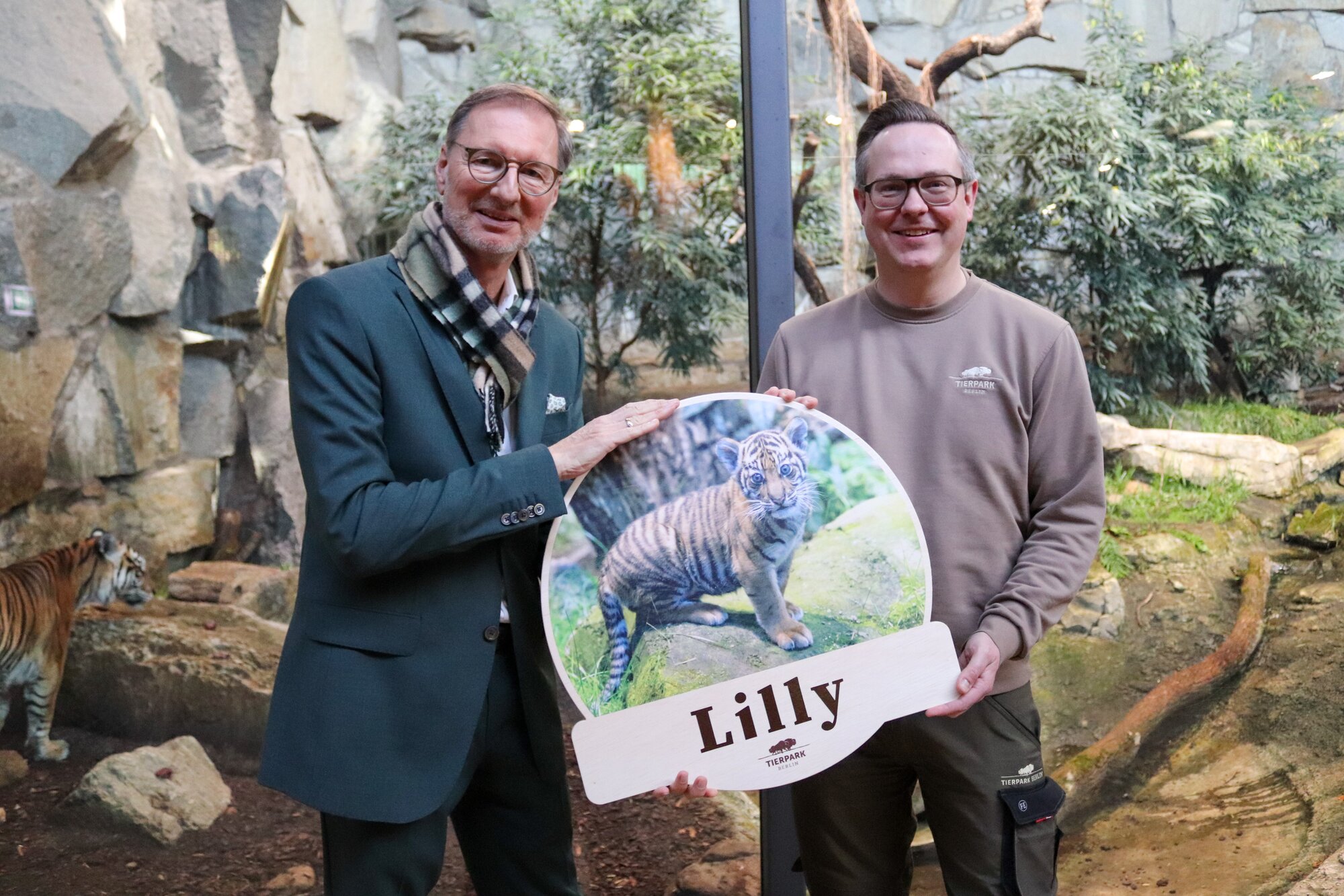 Die Namenswahl erfolgte aus über 1.000 Vorschlägen, die die Tierpark-Gäste im Februar durch eine Mitmach-Aktion am Tigergehege einreichen konnten. Nach Auswertung durch die „Tigerjury“ fiel die Entscheidung auf die oft eingereichte Namensidee „Lilly“ – ein kurzer, einprägsamer Name, der gut zum Jungtier passt und auch eine sympathische literarische Referenz enthält: Die Figur Tigerlily aus Peter Pan ist mutig, clever und hat einen eigenen Kopf. Eigenschaften, die auch bei dem kleinen Tiger-Mädchen wiederzuerkennen sind. Bei der feierlichen Namensverkündung im Regenwaldhaus waren neben der Patin, der Bezirksstadträtin von Lichtenberg, auch Vertreter der indonesischen Botschaft zugegen, um diesen besonderen Moment mitzuerleben. „Sumatra-Tiger gelten als die seltensten Großkatzen der Welt. Durch Lebensraumverlust und menschliche Eingriffe ist ihre Population in der Wildnis auf nur noch etwa 400 bis 600 Tiere geschrumpft“, erklärt Zoo- und Tierparkdirektor Dr. Andreas Knieriem. „Mayang und Lilly sind bereits für die Gäste des Tierparks zu sehen. Auch wenn Mutter und Jungtier weiterhin viel Zeit für Zweisamkeit benötigen, werden die Erkundungsausflüge ins Innengehege inzwischen immer häufiger.“ Bei Sumatra-Tigern liegt die Aufzucht der Jungtiere vollständig in der Verantwortung der Mutter.