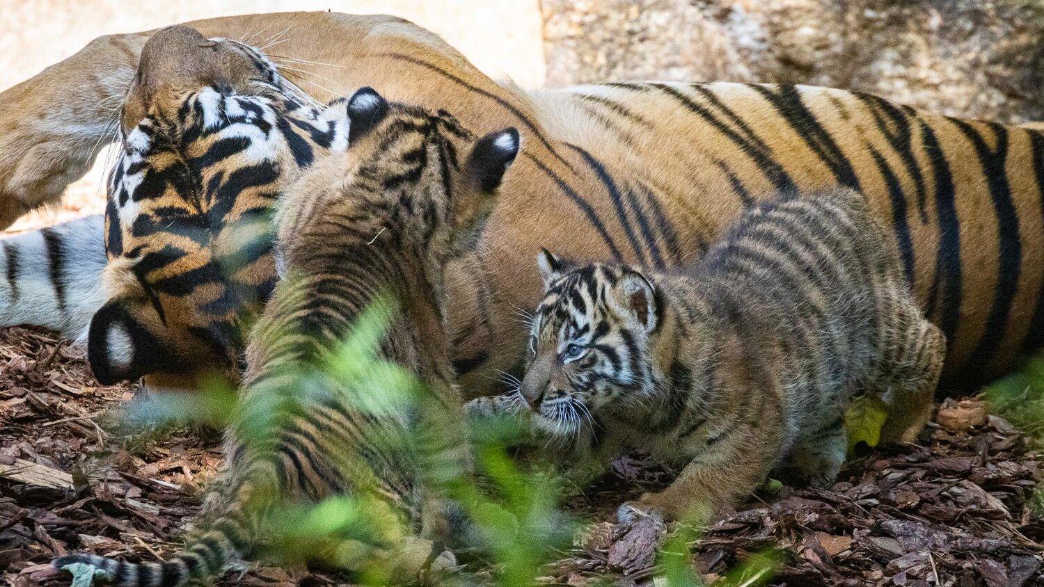 Still under the watchful eye of their parents Mayang and Jae Jae, the Sumatran tiger twins are exploring their outdoor habitat. With a bit of luck, you might get to see them at the Tierpark this weekend.